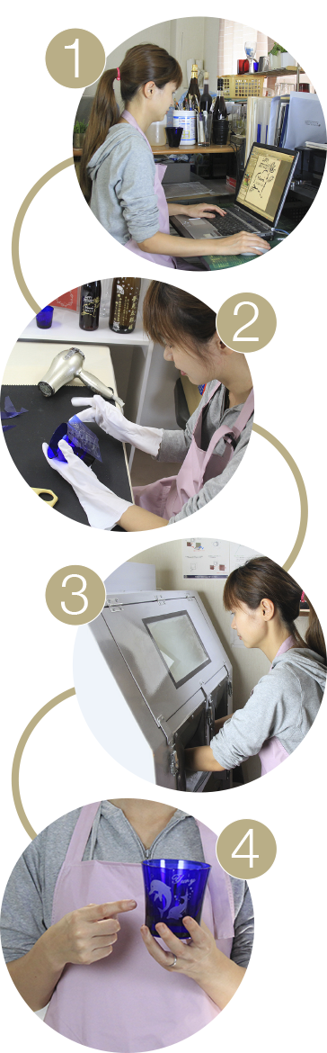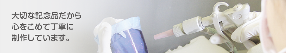 サンドブラストとは、表面に砂などの研磨材を吹き付け削る技法で、細かな部分まで奇麗に加工することが可能です。そのため、いろいろな用途に応じたデザインも忠実に表現し、心のこもった感動的な贈答品を提供しています。